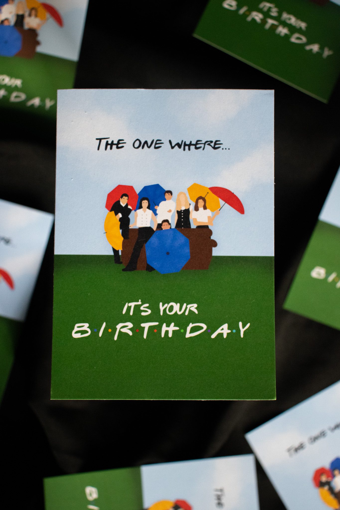 This illustrated A6 postcard is your go-to for birthday wishes with a nostalgic twist, because some moments deserve to be celebrated with a little TV magic. Inspired by the most iconic group of six friends from the '90s (you know the ones), this design features a playful, minimalist illustration complete with colorful umbrellas and that unmistakable font that gives all the cozy, familiar feels. Whether you're a die-hard fan or just love a good pop culture reference, this card captures the warmth, humor, and heart of those unforgettable episodes.